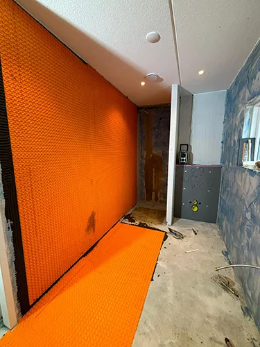 De bewoners hebben gekozen voor zowel wand als vloerverwarming van de firma Schlúter en ook de mooie onopvallende drain komt van deze firma.